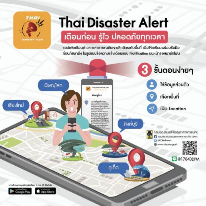 เชิญชวนติดตั้งแอปพลิเคชั่น "Thai Disaster Alert" ในโทรศัพท์เคลื่อนที่ เพื่อรับข่าวสารการแจ้งเตือนภัย
