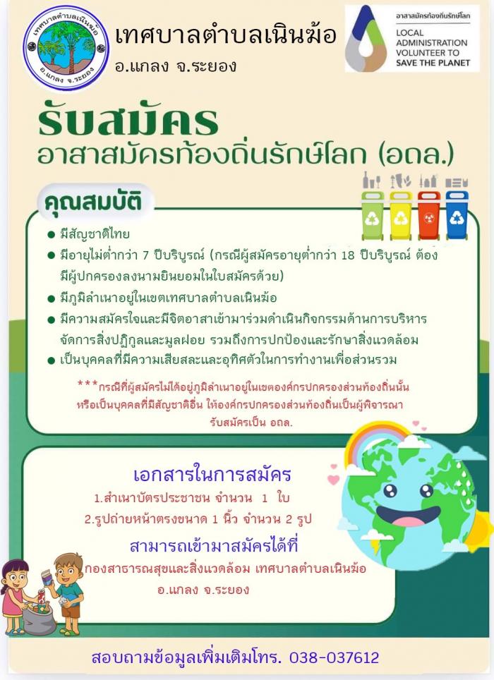 ประชาสัมพันธ์เทศบาลตำบลเนินฆ้อ รับสมัครอาสาสมัครท้องถิ่นรักษ์โลก (อถล.)