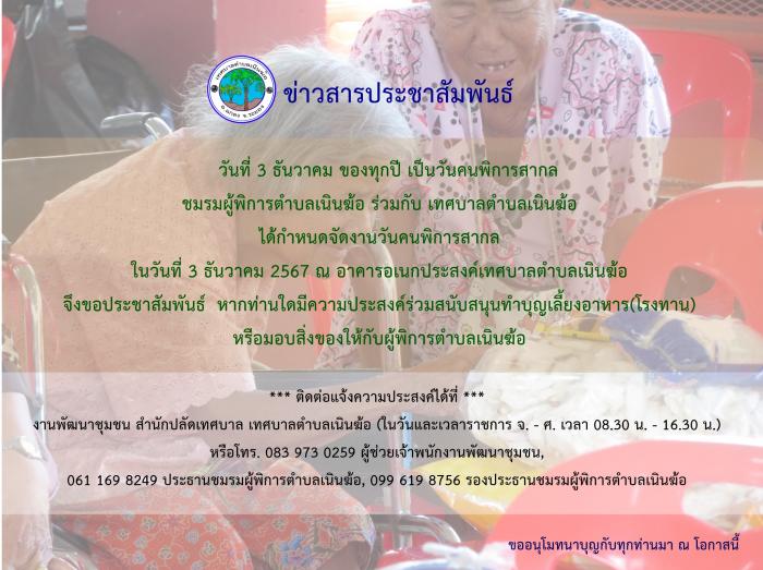ขอเชิญชวนร่วมสนับสนุนทำบุญเลี้ยงอาหาร (โรงทาน) หรือ มอบสิ่งของให้กับผู้พิการตำบลเนินฆ้อ เนื่องในวันคนพิการสากล ประจำปี 2567