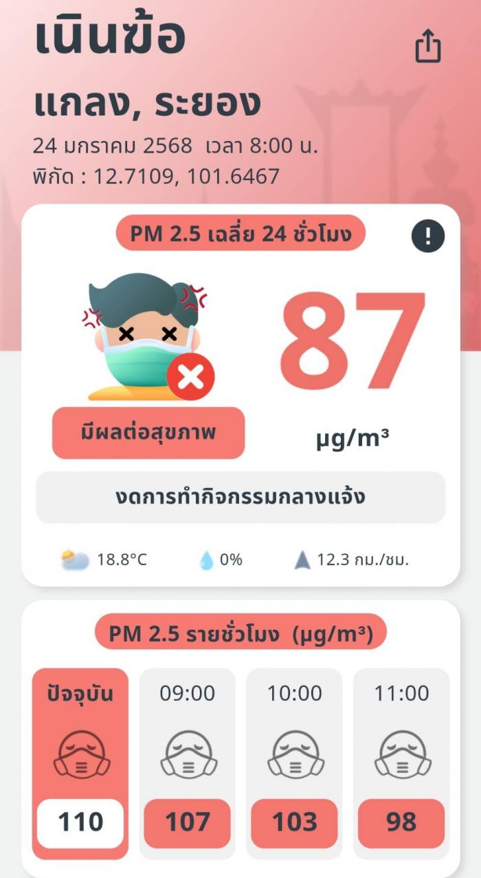 แจ้งเตือนพี่น้องประชาชนตำบลเนินฆ้อ เนื่องจากค่า PM 2.5 โดยเฉลี่ย 24 ชั่วโมงในวันนี้ (สูง) และแนวทางการดำเนินชีวิต