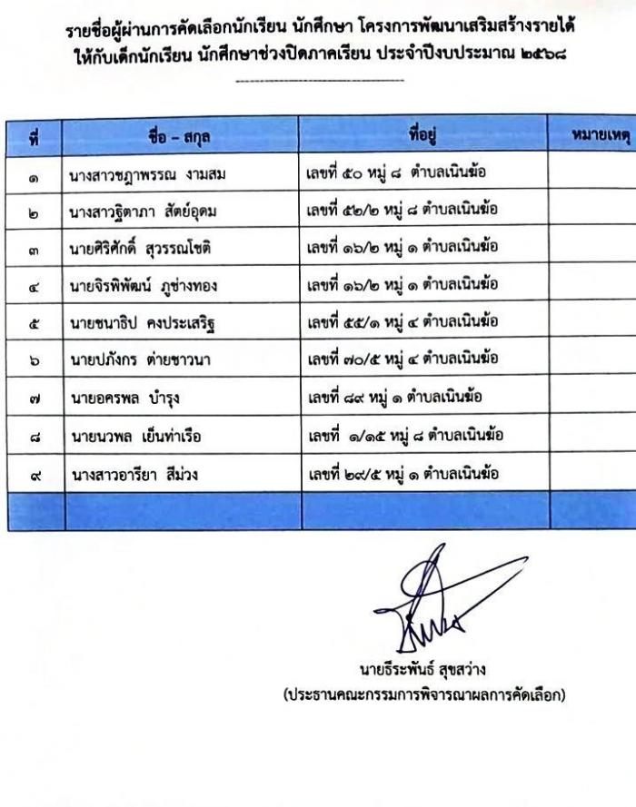 ประกาศรายชื่อผู้ผ่านการคัดเลือก นักเรียน นักศึกษา ทำงานโครงการพัฒนาเสริมสร้างรายได้ให้กับเด็กนักเรียน นักศึกษาในช่วงปิดภาคเรียน ประจำปีงบประมาณ 2568