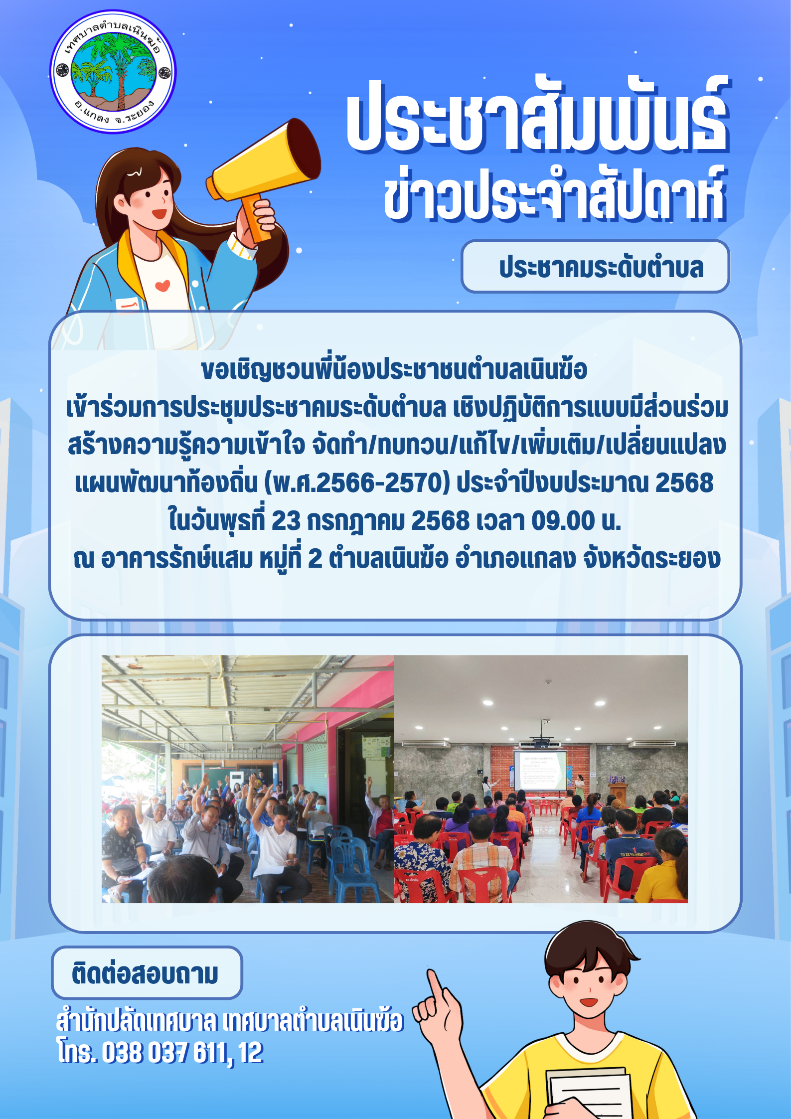 ขอเชิญเข้าร่วมประชุมประชาคมระดับตำบล เชิงปฏิบัติการแบบมีส่วนร่วม แผนพัฒนาท้องถิ่น (พ.ศ.2566-2570) ประจำปีงบประมาณ 2568