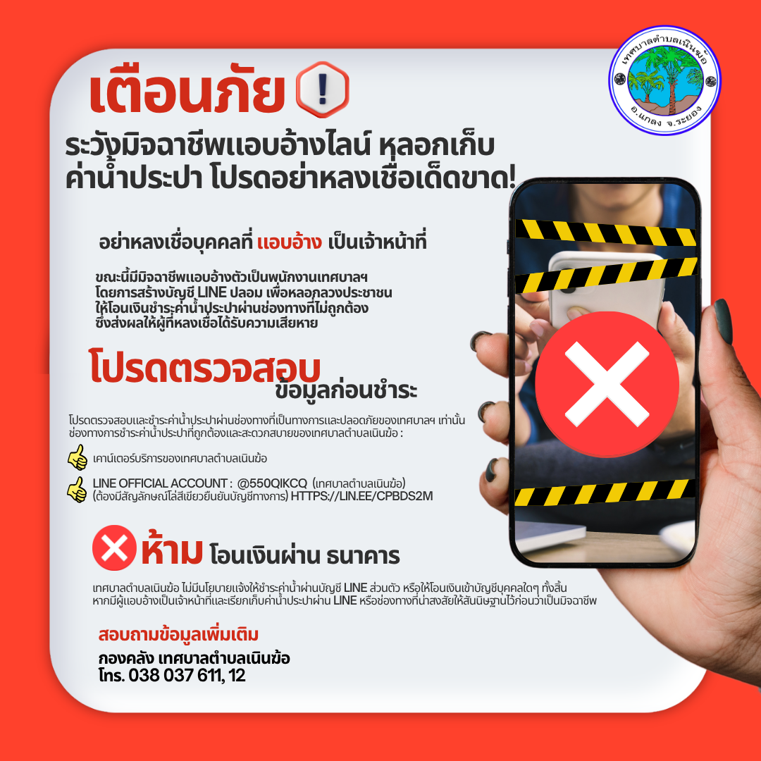 เตือนภัย!!! ระวังมิจฉาชีพแอบอ้างไลน์ หลอกเก็บค่าน้ำประปา โปรดอย่าหลงเชื่อเด็ดขาด! จ่ายค่าน้ำประปาต้องผ่านช่องทางหลักของเทศบาลตำบลเนินฆ้อเท่านั้น!