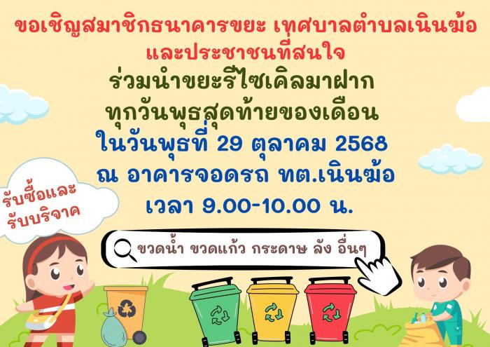 ขอเชิญชวนสมาชิกธนาคารขยะ และพี่น้องประชาชนทุกท่าน สมัครเป็นสมาชิก และนำขยะรีไซเคิลมาฝาก เพื่อเป็นรายได้และร่วมทำบุญในโครงการ 1 อปท. 1 ธนาคารขยะ