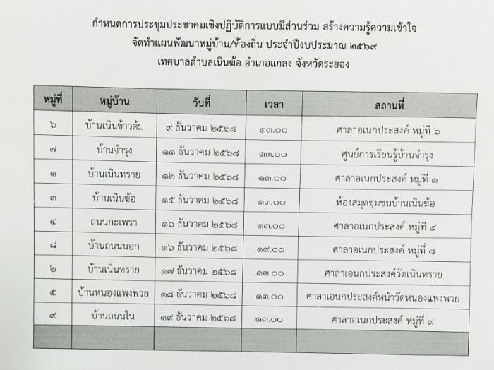 กำหนดวัน เวลา และสถานที่ จัดเวทีประชุมประชาคมเชิงปฏิบัติการแบบมีส่วนร่วม สร้างความรู้ความเข้าใจ จัดทำแผนพัฒนาหมู่บ้าน/ท้องถิ่น ประจำปีงบประมาณ 2569