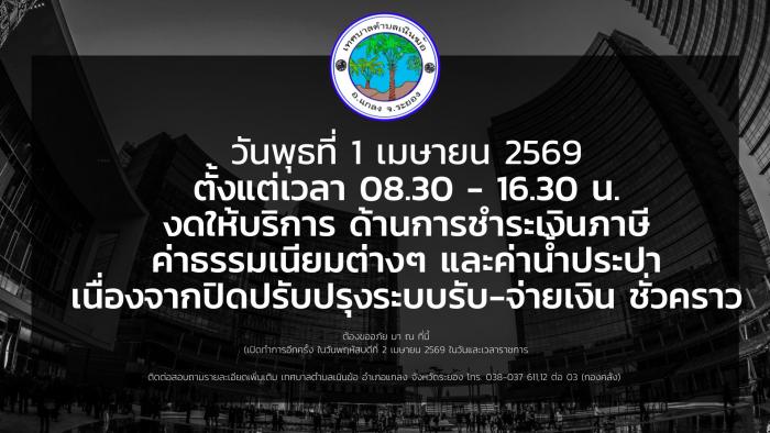 งดให้บริการ ด้านการชำระเงินภาษี ค่าธรรมเนียมต่างๆ และค่าน้ำประปาเนื่องจากปิดปรับปรุงระบบรับ-จ่ายเงิน ชั่วคราว