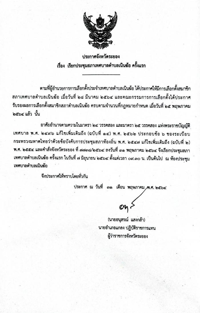 ประกาศจังหวัดระยอง เรื่อง เรียกประชุมสภาเทศบาลตำบลเนินฆ้อ ครั้งแรก (31 พ.ค. 64)