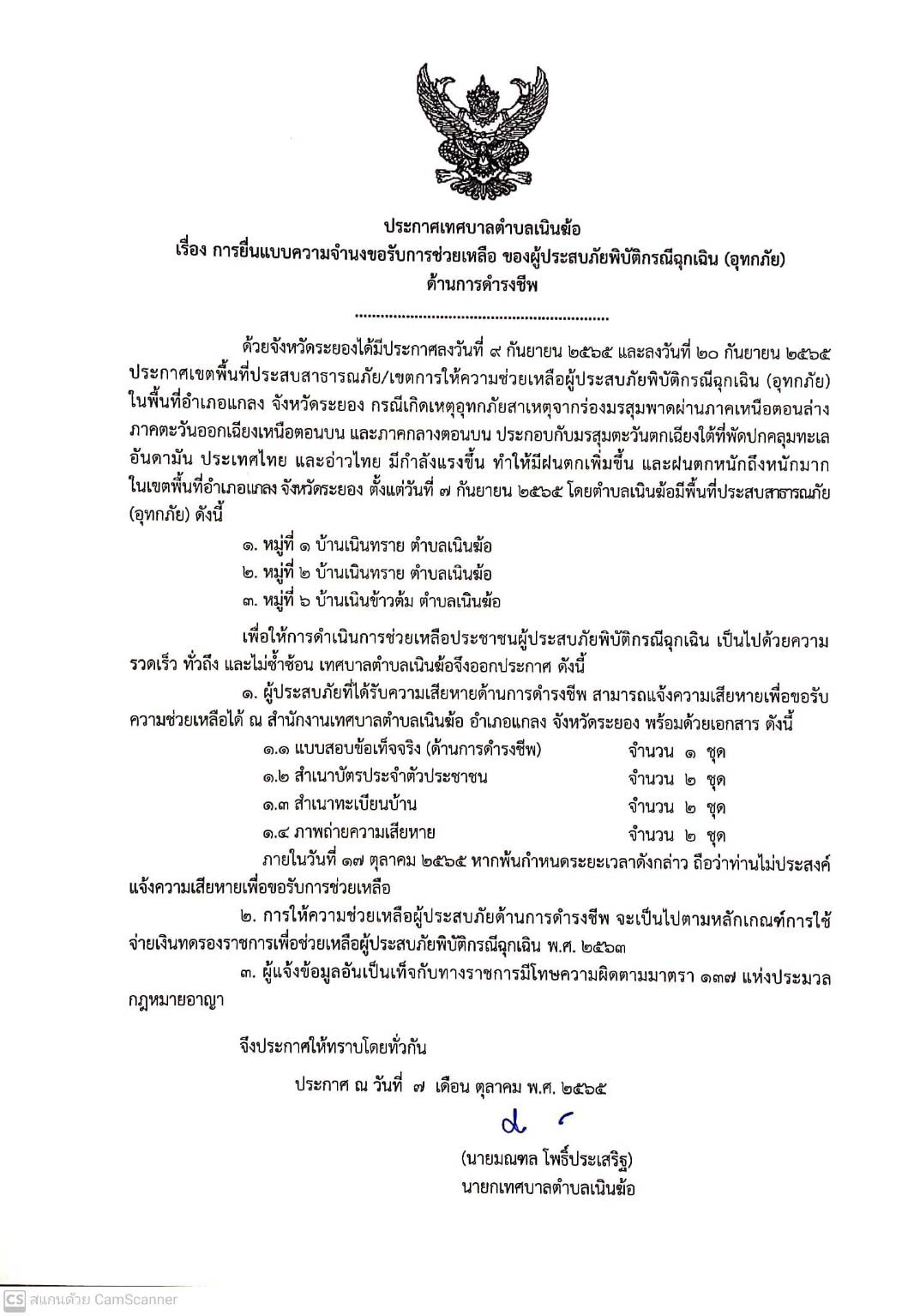 ประกาศเทศบาลตำบลเนินฆ้อ เรื่อง การยื่นแบบความจำนงขอรับการช่วยเหลือ ของผู้ประสบภัยพิบัติกรณีฉุกเฉิน (อุทกภัย) ด้านการดำรงชีพ