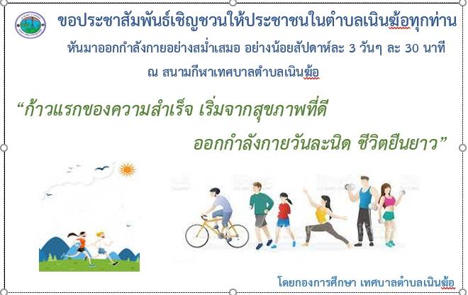 เทศบาลตำบลเนินฆ้อ ขอเชิญชวนให้ประชาชนในตำบลเนินฆ้อทุกท่าน ออกกำลังกายอย่างสม่ำเสมออย่างน้อยสัปดาห์ละ 3 วันวันละ 30 นาที ณ สนามกีฬาเทศบาลตำบลเนินฆ้อ />