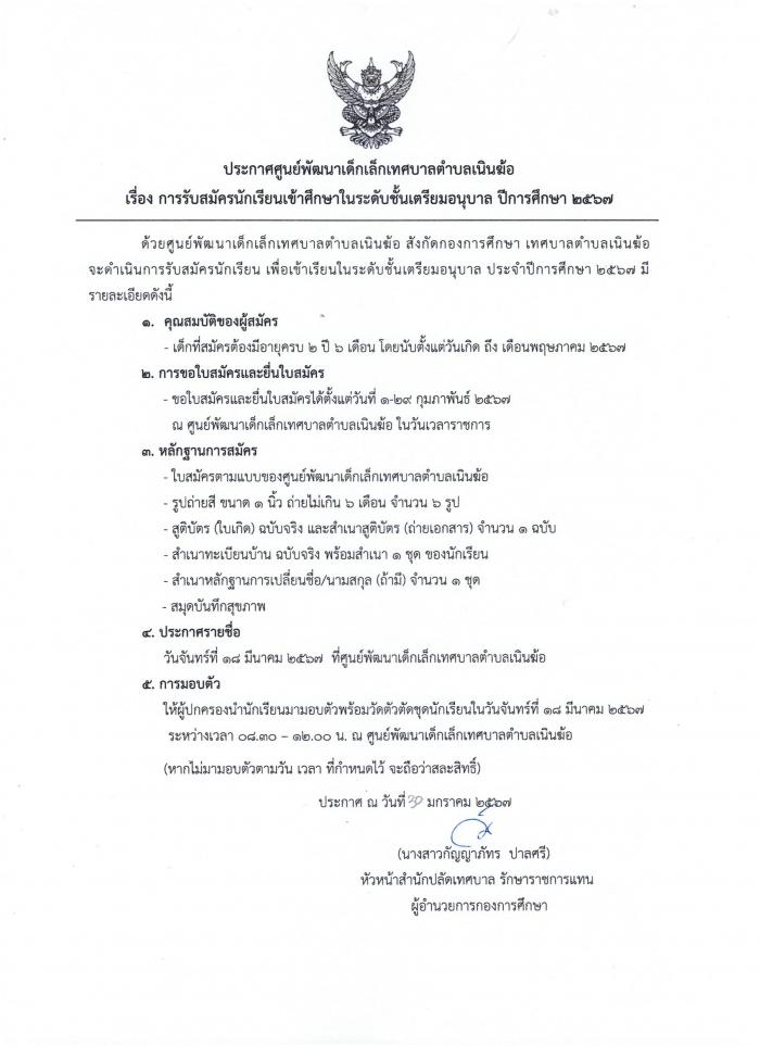 ประกาศศูนย์พัฒนาเด็กเล็กเทศบาลตำบลเนินฆ้อ เรื่อง การรับสมัครนักเรียนเข้าศึกษาในระดับชั้นเตรียมอนุบาล ปีการศึกษา 2567