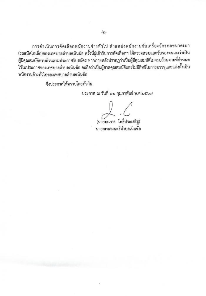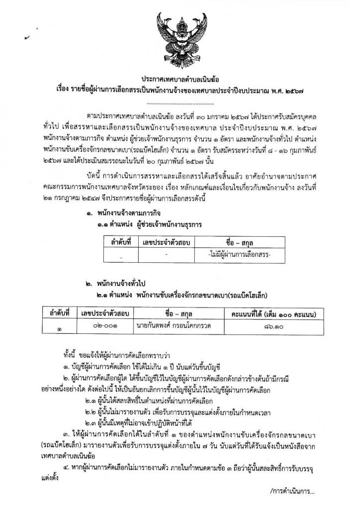 ประกาศเทศบาลตำบลเนินฆ้อ เรื่อง รายชื่อผู้ผ่านการเลือกสรรเป็นพนักงานจ้างของเทศบาลประจำปีงบประมาณ พ.ศ.2567
