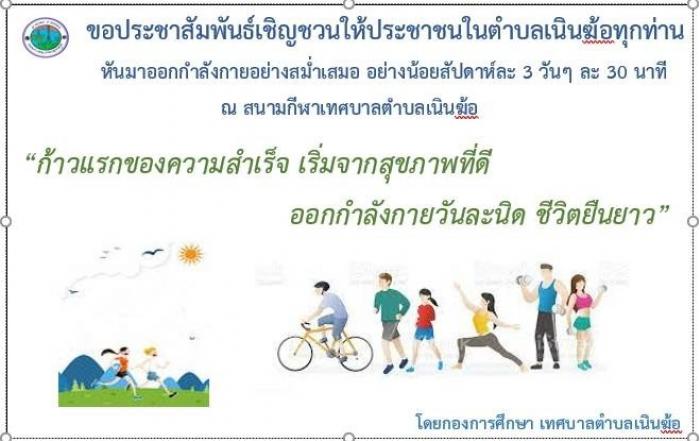 เทศบาลตำบลเนินฆ้อ ขอเชิญชวนให้ประชาชนในตำบลเนินฆ้อทุกท่าน ออกกำลังกายอย่างสม่ำเสมออย่างน้อยสัปดาห์ละ 3 วันวันละ 30 นาที ณ สนามกีฬาเทศบาลตำบลเนินฆ้อ