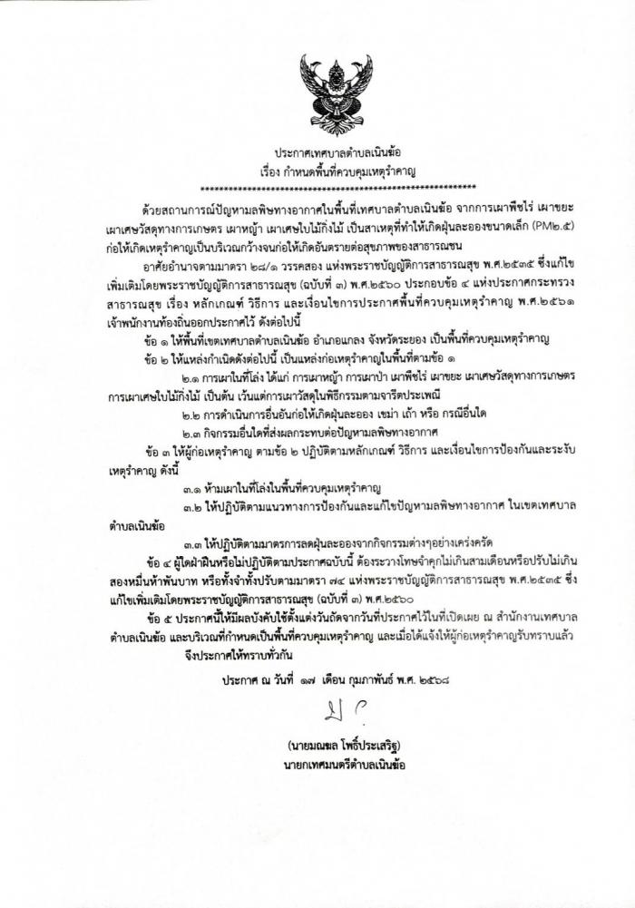 ประกาศเทศบาลตำบลเนินฆ้อ เรื่อง กำหนดพื้นที่ควบคุมเหตุรำคาญ