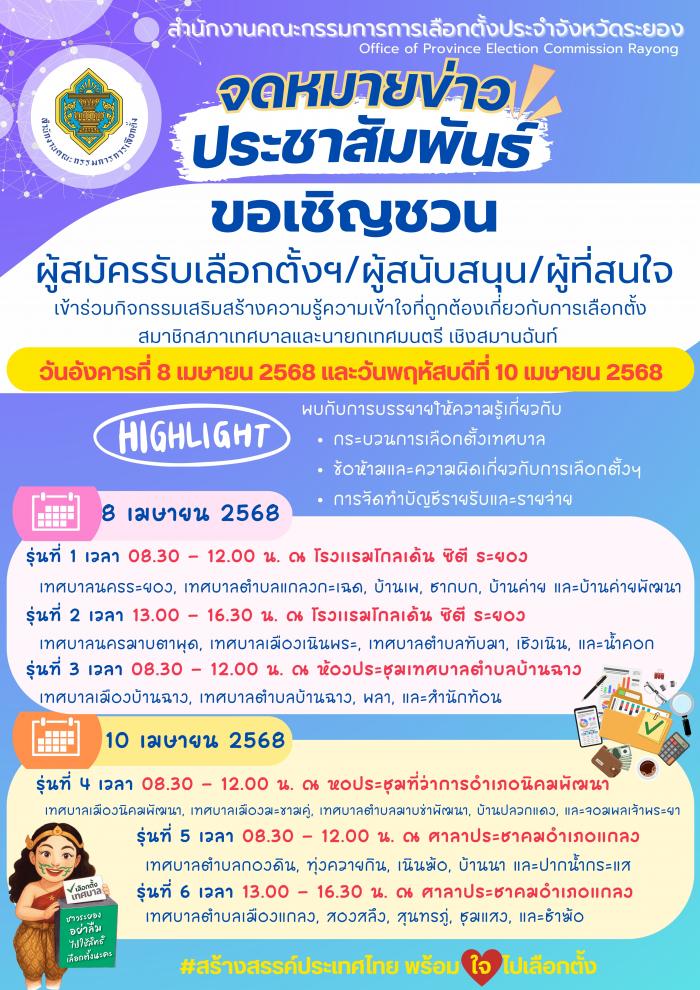 ขอเชิญชวนผู้สมัครรับเลือกตั้งฯ/ผู้สนับสนุน/ผู้สนใจ เข้าร่วมกิจกรรมเสริมสร้างความรู้ความเข้าใจที่ถูกต้องเกี่ยวกับการเลือกตั้งสมาชิกสภาเทศบาลและนายกเทศมนตรี เชิงสมานฉันท์ ดังรายละเอียดด้านล่างนี้