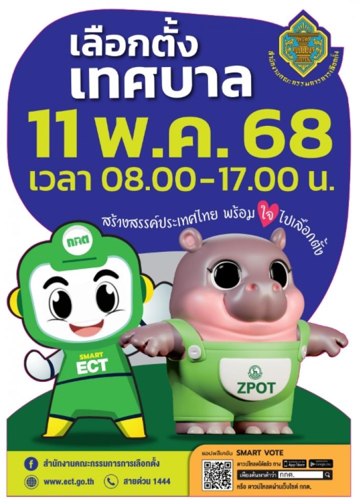 สร้างสรรค์ประเทศไทย พร้อมใจ ไปเลือกตั้ง เลือกตั้งเทศบาล 11 พฤษภาคม 2568 เวลา 08.00 - 17.00 น. ณ หน่วยเลือกตั้งที่ท่านมีรายชื่ออยู่