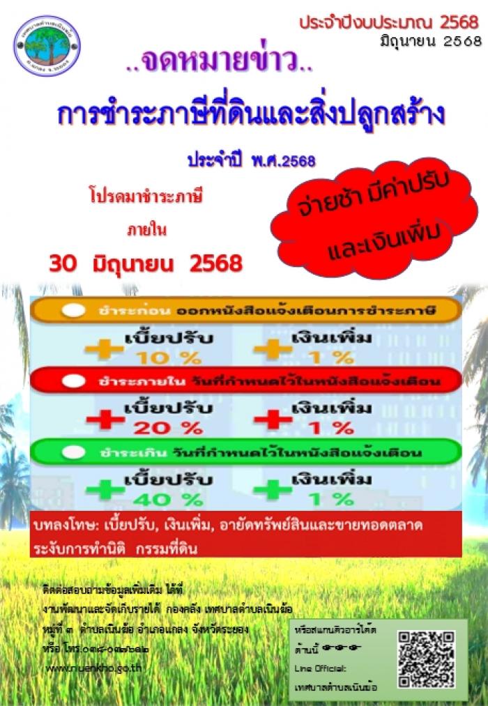 ประชาสัมพันธ์ย้ำเตือน!!! เรื่อง การชำระภาษีที่ดินและสิ่งปลูกสร้าง ประจำปี พ.ศ.2568