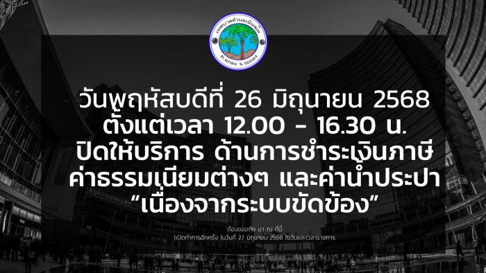 ประกาศเทศบาลตำบลเนินฆ้อ เรื่อง ปิดให้บริการ ด้านการชำระเงินภาษี ค่าธรรมต่างๆ และค่าน้ำประปา ชั่วคราว " เนื่องจากระบบขัดข้อง"