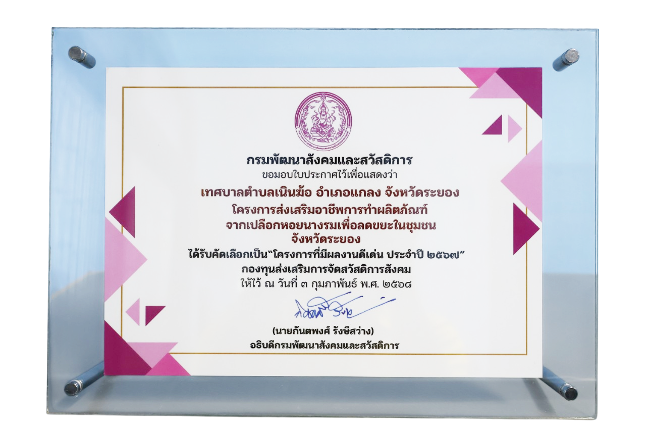 โล่รางวัล โครงการที่มีผลงานดีเด่น ประจำปี 2567 โครงการส่งเสริมอาชีพการทำผลิตภัณฑ์จากเปลือกหอยนางรมเพื่อลดขยะในชุมชนจังหวัดระยอง กรมพัฒนาสังคมและสวัสดิการ ให้ไว้ ณ 3 กุมภาพันธ์ 2568