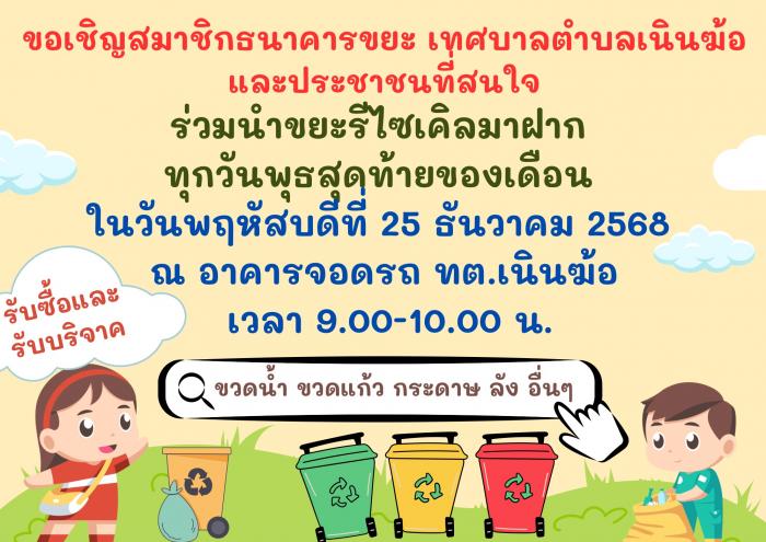 ขอเชิญชวนสมาชิกธนาคารขยะ และพี่น้องประชาชนทุกท่าน สมัครเป็นสมาชิก และนำขยะรีไซเคิลมาฝาก เพื่อเป็นรายได้และร่วมทำบุญในโครงการ 1 อปท. 1 ธนาคารขยะ ของกฎกระทรวงมหาดไทยและขับเคลื่อนนโยบาย การจัดการขยะ