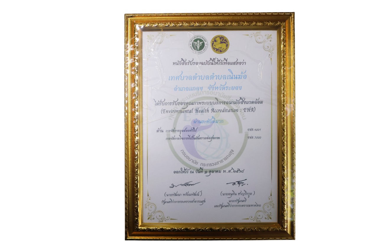 หนังสือรับรองคุณภาพระบบบริการอนามัยสิ่งแวดล้อม ของเทศบาลตำบลเนินฆ้อ ผ่านระดับดีมาก ด้านการจัดการมูลฝอยทั่วไป และการจัดการกิจการที่เป็นอันตรายต่อสุขภาพ ณ ที่วันที่ 1 ตุลาคม 2568