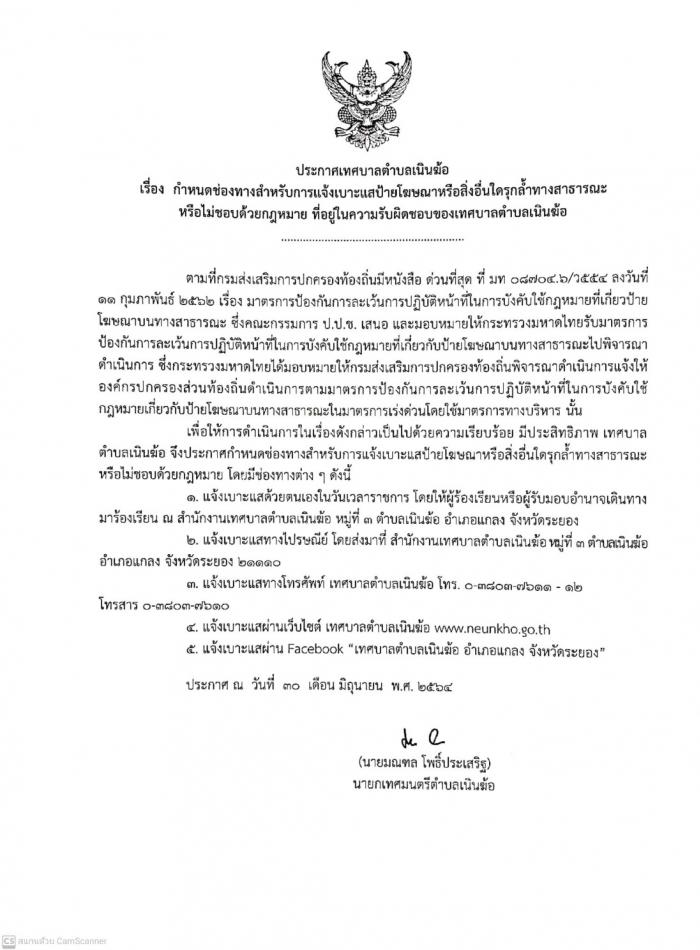ประกาศเทศบาลตำบลเนินฆ้อ เรื่อง ช่องทางสำหรับการแจ้งเบาะแสป้ายโฆษณาหรือสิ่งอื่นใดที่รุกล้ำทางสาธารณะฯ