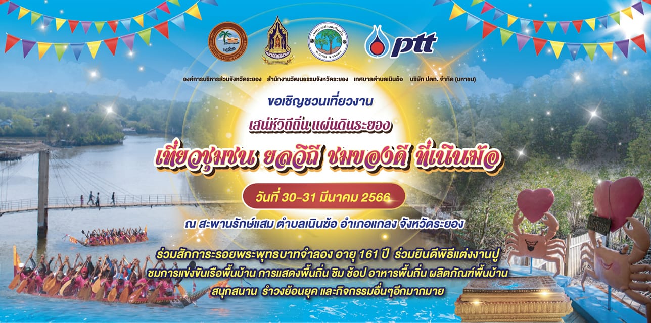 ขอเชิญชวนพี่น้องประชาชนเที่ยวงานเสน่ห์วิถีถิ่น แผ่นดินระยอง เที่ยวชุมชน ยลวิถี ชมของดี ที่เนินฆ้อ วันที่ 30-31 มีนาคม 2566 ณ สะพานรักษ์แสม ตำบลเนินฆ้อ อำเภอแกลง จังหวัดระยอง